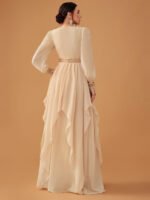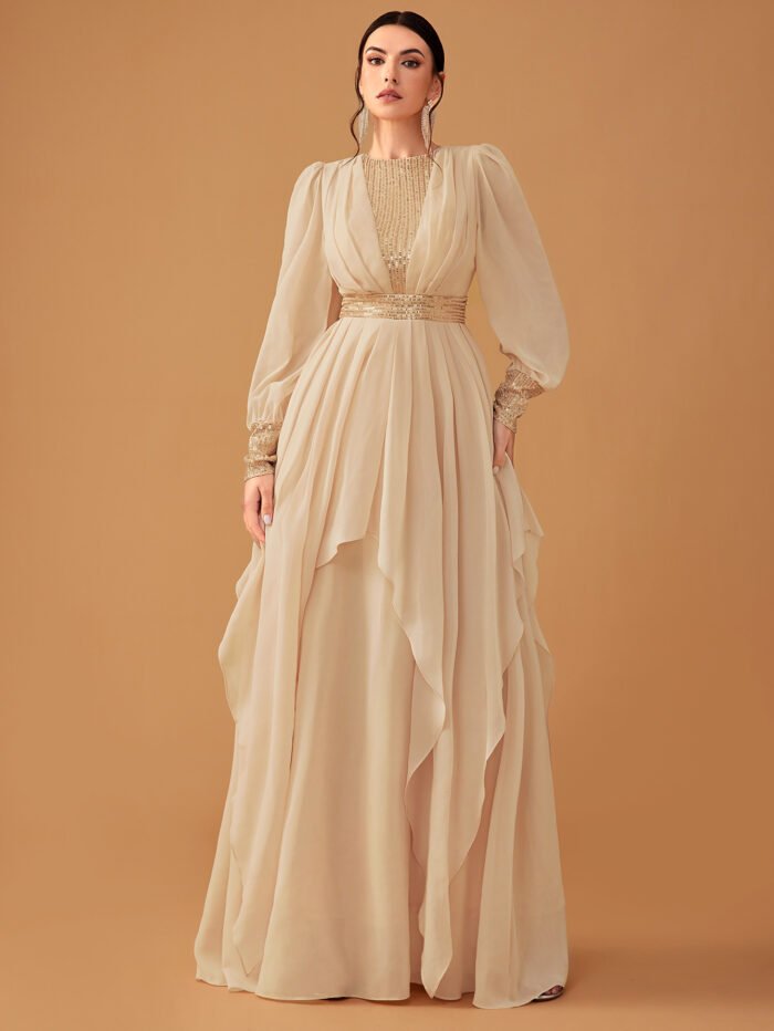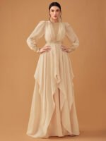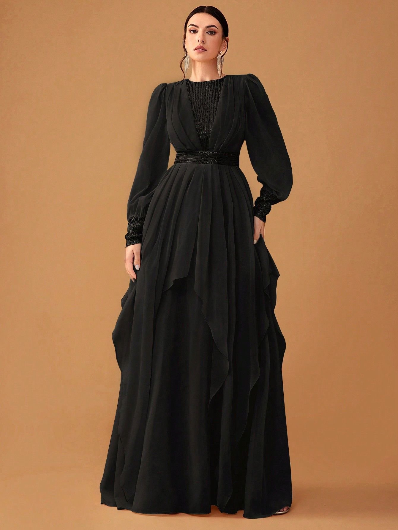 Giffniseti Wholesale Sequin Prom Dresses – New Women’s Prom Evening Dress Elegant Chiffon with Sequin Panels Lantern Sleeve Waist-cinching Dress-MGT1144
