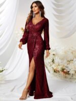 Giffniseti Wholesale Sequin Prom Dresses – Western-style Long Gown Sequin V-neck Long Sleeve High Slit Slim Fit Mermaid Prom Dress-MGT256