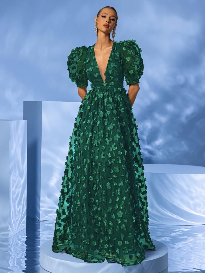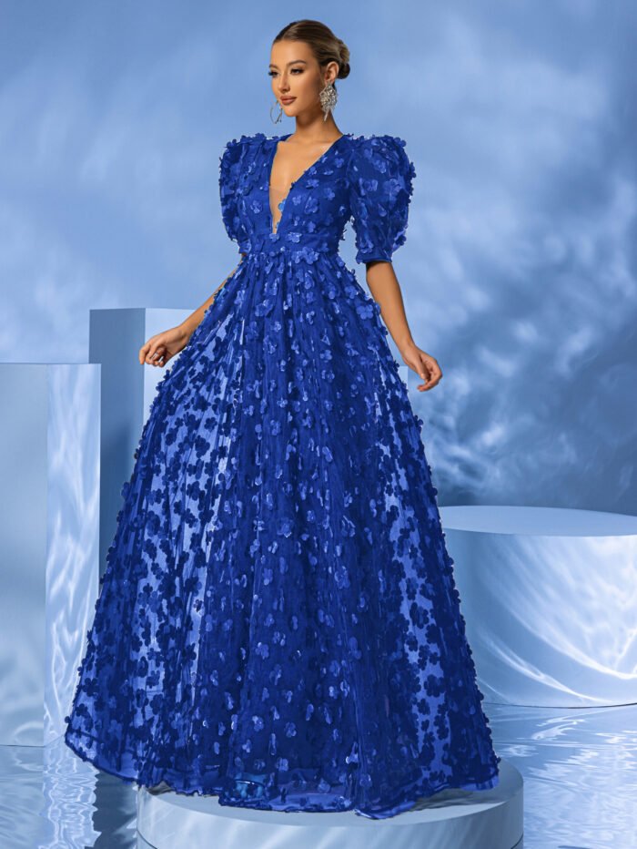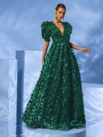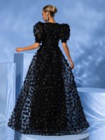 Giffniseti Wholesale Sequin Prom Dresses – Women’s Deep V Prom Evening Dress Puff Short Sleeve 3D Floral Mesh Black Gown-CJT20094
